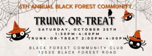We hope you can join us for the 2025 Black Forest Community Trunk-Or-Treat on Saturday, October 25th from 1:30pm – 4:00pm. All donations benefit the Black Forest Community Club for the event itself and ongoing maintenance of the Community Center.